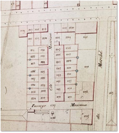 En 1857, les époux achètent de nouveaux terrains, les lots 193, 194, 200 et 201 de l’ancien domaine royal, qui forment un carré à l’angle de la rue Perronet et de celle du marché (qui deviendra la rue Madeleaine Michelis).